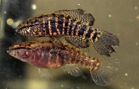Elassoma zonatum, Banded Pygmy Sunfish, breeding male above, female below, Black River, Cape Fear basin North Carolina, USA